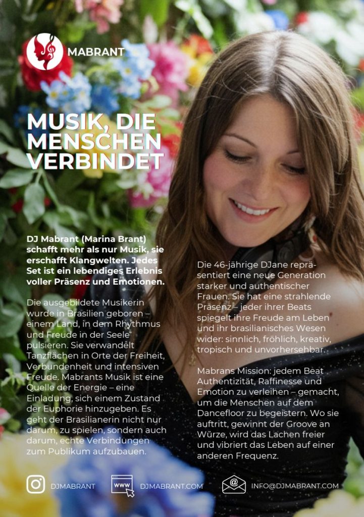 DJ Mabrant (Marina Brant) schafft mehr als nur Musik, sie erschafft Klangwelten. Jedes Set ist ein lebendiges Erlebnis voller Präsenz und Emotionen.